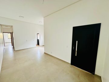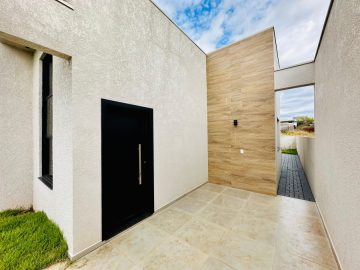 Casa de 59,89m², 2 quartos, sala/cozinha, banheiro, área de serviços Churrasqueira, sobra de terreno, gesso, pé direito duplo Garagem, esquadrias e porta de alumínio, porcelanato